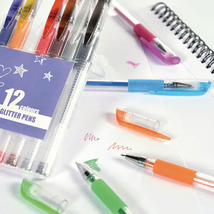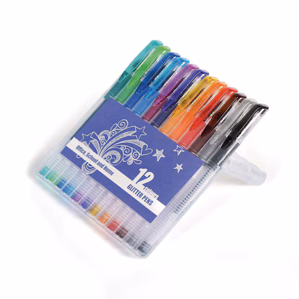 Glitter-geelikynät 1 mm:n metallikärjellä käytännöllisessä itseseisovassa kotelossa, jonka avulla oikean värin löytäminen on helppoa.
