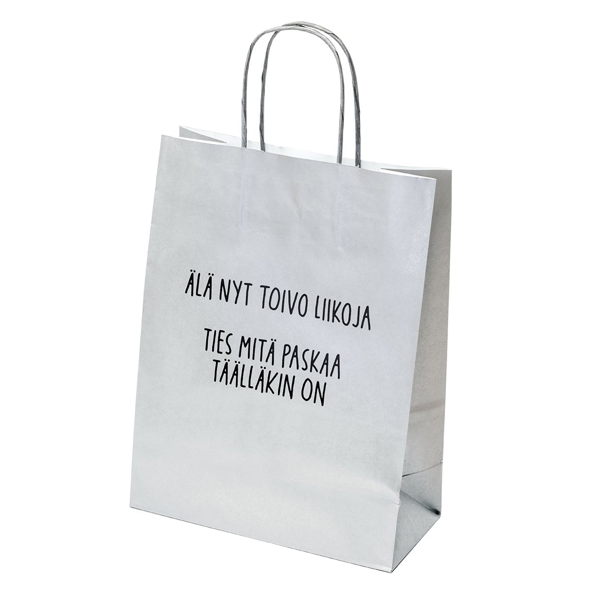 Älä nyt toivo liikoja, ties mitä paskaa täälläkin on. Melko tyhjentävästi kerrottu kyseisestä lahjakassista. Mutta se on tyylikäs, hopean värinen lahjakassi! Lahjakassin koko 22x29x10cm, täytä jollain huonon huumorin lahjalla.