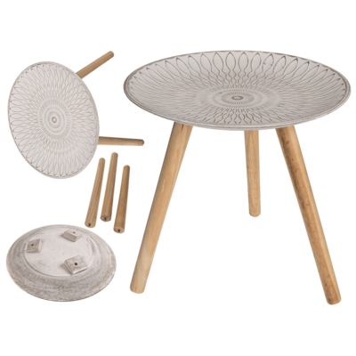 Puinen, pinnastaan kuvioitu pikkupöytä. Maalattu osittain kuultavan valkoiseksi.